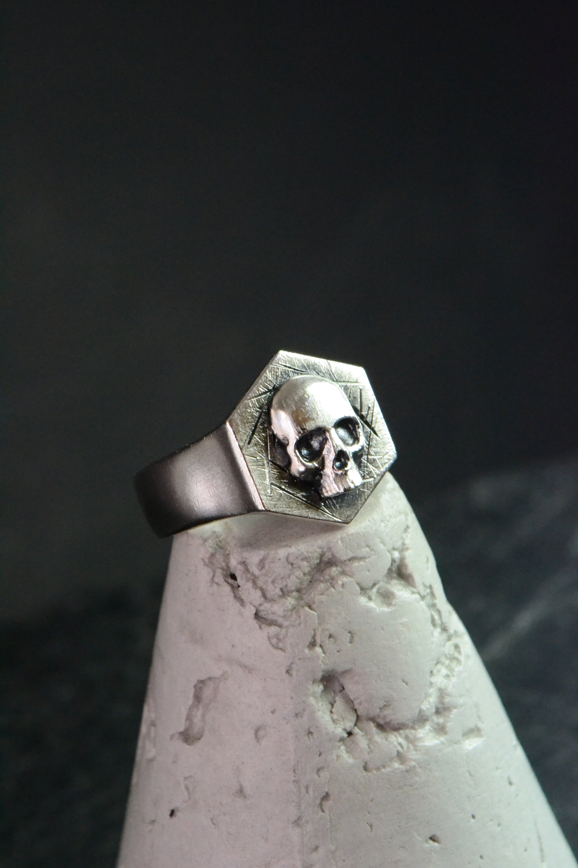 --ACHERON--Gothic Skull Ring, Mens Biker Signet Ring, Sterling Silver Pinky Ring, Hexagon Geometric Gothic Chevalier Jewelry